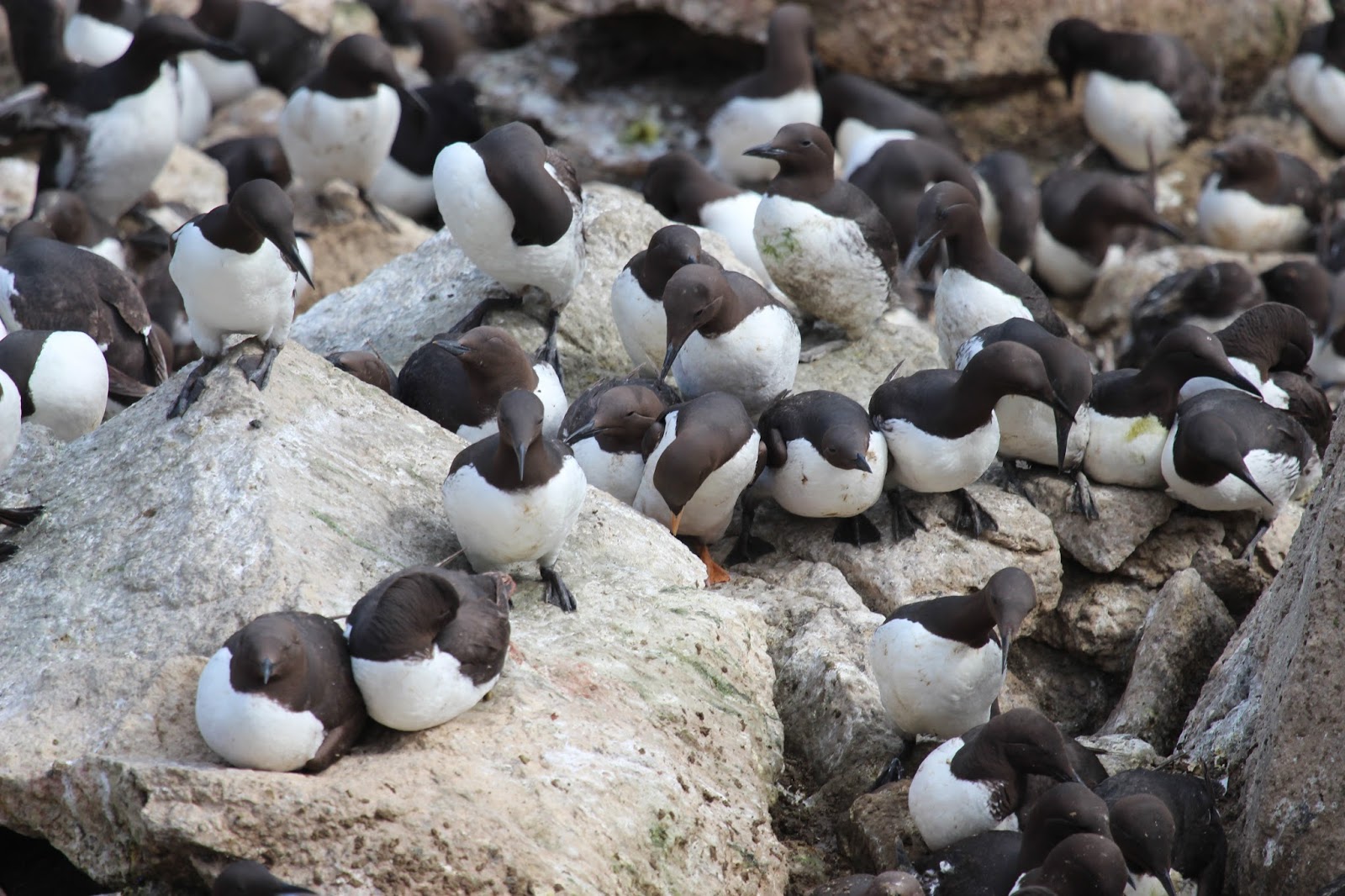 But sometimes you just can't go wrong with dressing in all black! The below picture shows another rarity in the color morph of Common murres. This all black bird that was photographed by research assistant Lindsey Broadus at the Sea Lion Cove colony may be an even rarer trait within the population compared to the orange billed murre. Pete said that this is the first documentation of a black murre on the islands and the only other record he is aware of was recorded during Point Blue's ACCESS cruises. Two interesting color morphs in one season!